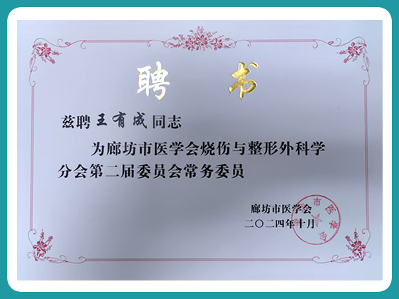 王有成,烧伤科主任,毕业于河北医科大学,廊坊创面修复协会常委,河北省血管健康与技术协会糖尿病足专业委员会委员,烧伤与整形外科学分会第一届委员会委员,第二届常委。曾为廊坊钩活术执行人,从事烧伤整 形专业21年,研究方向为烧伤后期的瘢痕整形、功能恢复、皮肤再生医疗技术的临床应用,针对慢性溃疡治疗采用微粒皮种植+臭氧+再生疗法治愈病人上千例,在省部级学术刊物发表论文多篇。